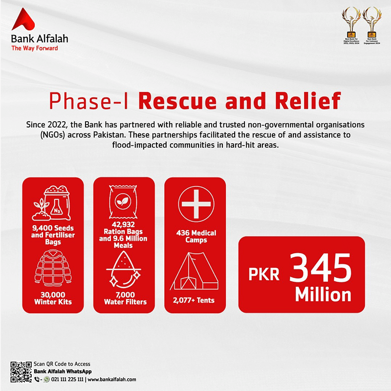 Bank Alfalah, a leading commercial Bank in Pakistan, reported the comprehensive highlights of its over two years of commitment to the flood-affected communities, which commenced in 2022 after the devastating floods impacted one-third of Pakistan. To date, Bank Alfalah has disbursed approximately PKR 2 billion through this programme, providing a sustainable way forward to over 1 million beneficiaries and positioning itself as one of the most significant corporate contributors to fostering a sustainable future for flood-impacted communities.