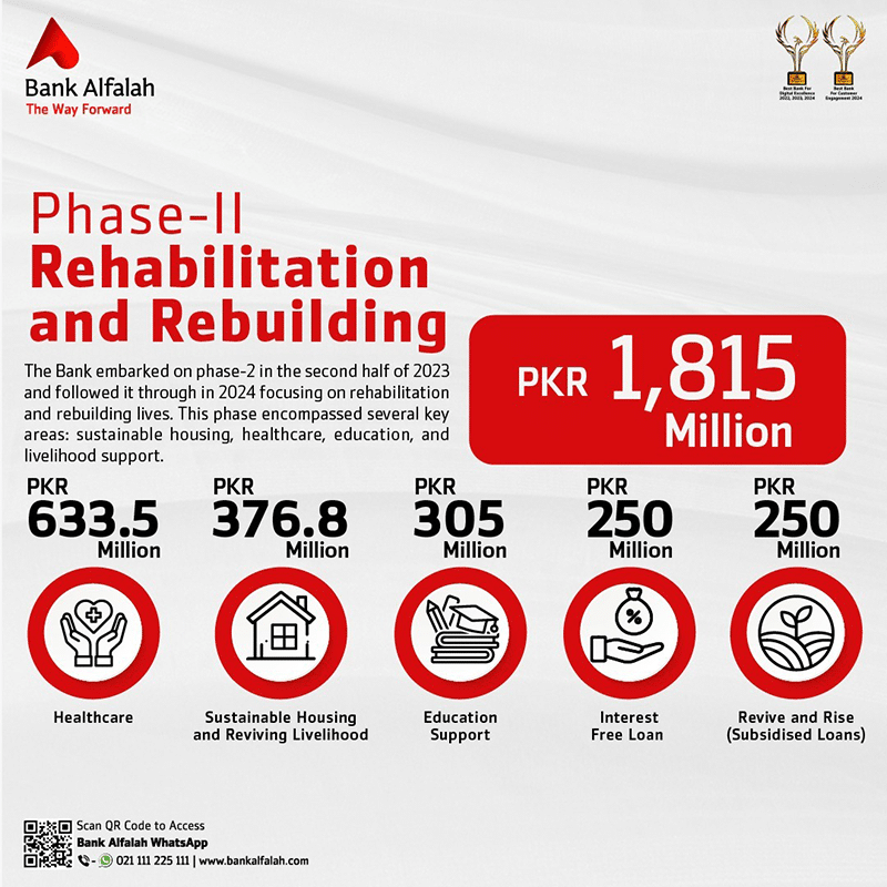 The Bank embarked on phase 2 in the second half of 2023 and followed it through in 2024  with a disbursement of PKR 1,815 million, focusing on rehabilitation and rebuilding lives. This phase encompassed several key areas: sustainable housing, healthcare, education, and livelihood support.