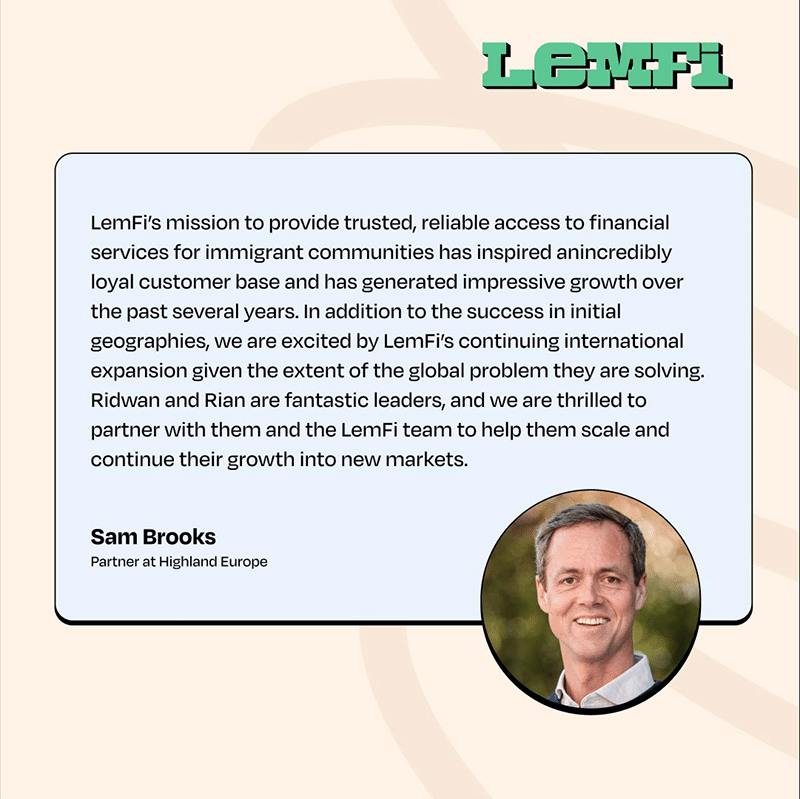 Sam Brooks, Partner at Highland Europe, said: “LemFi’s mission to provide trusted, reliable access to financial services for immigrant communities has inspired an incredibly loyal customer base and has generated impressive growth over the past several years. In addition to the success in initial geographies, we are excited by LemFi’s continuing international expansion given the extent of the global problem they are solving. Ridwan and Rian are fantastic leaders, and we are thrilled to partner with them and the LemFi team to help them scale and continue their growth into new markets.”